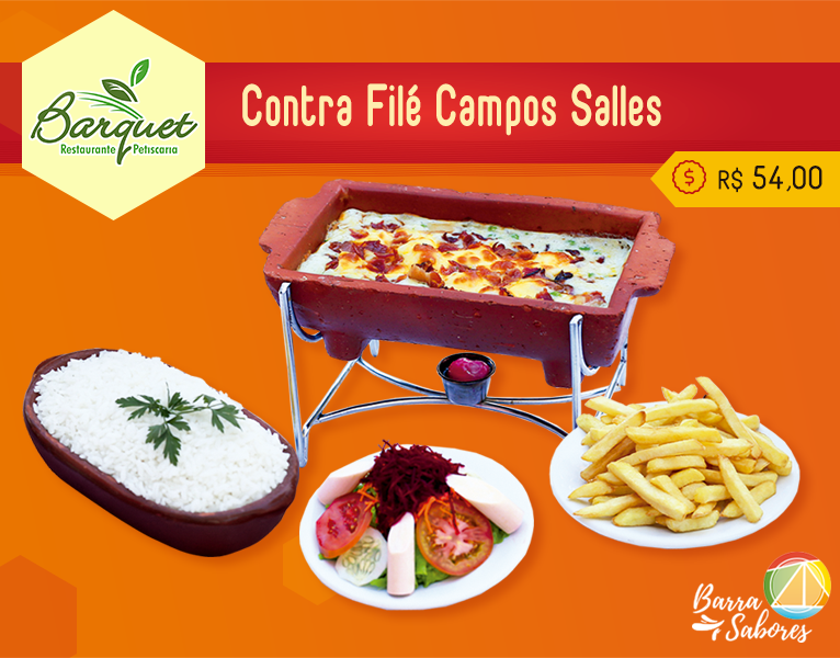 Contra filé com molho branco, queijo, ervilha fresca e champignon, gratinado com bacon. Acompanha arroz, salada e fritas.
