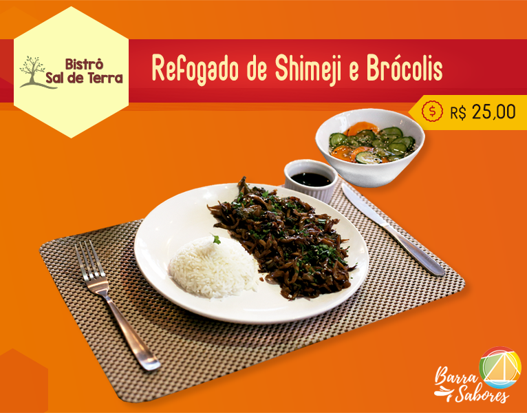 Refogado de Shimeji e Brócolis. Acompanha arroz branco ou integral e sunomono.