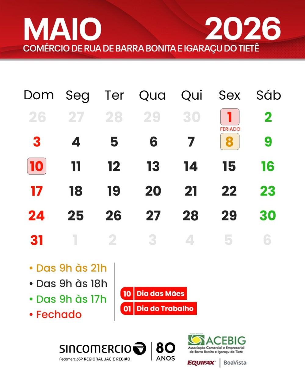 Calendário do Comércio – Maio 2026